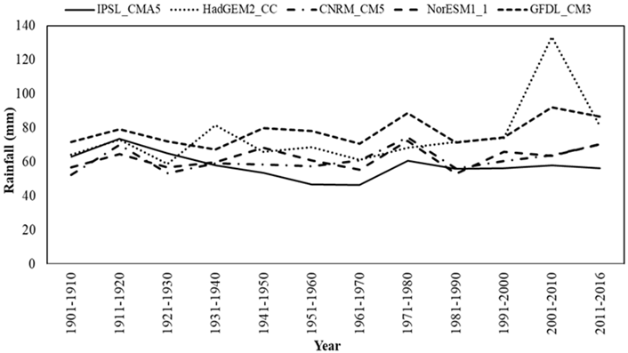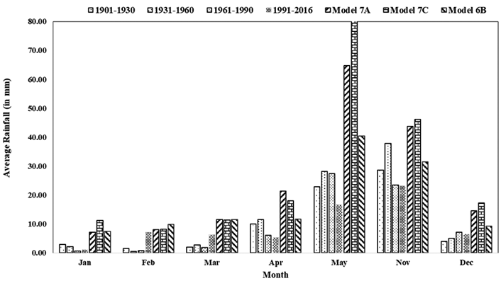 Along with the observed values, GCM data for rainfall, minimum and maximum temperature, surface humidity, 10m wind speed and pressure at mean sea level obtained from the Copernicus Climate Change Service website (https://cds.climate.copernicus.eu/) was used in this study. Data for all parameters from 5 GCMs was downloaded and extracted for past (1901 – 2016) and upcoming (2021-2050) years. The GCMs used in this study summarized in Table 1. These 5 GCMs are comparatively more precise for the Indian subcontinent and used by various researchers, like in the work done by Rana, et al. [9].