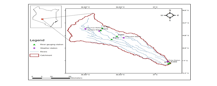 Thika River catchment is located in central Kenya and is the main source of water for Nairobi and surrounding areas. It covers an average area of 839 km2 and is situated between longitude 36.60º and 37.60º E and latitude 0.58º and 1.17º S (Figure. 1). The catchment has two main rivers, Thika and Chania, that has a confluence at gauging station 4CB04 that was selected as the outlet of the catchment. The region receives bimodal rainfall pattern with high peaks in March to May and short rains from October to December. The rainfall varies from 800 mm in low altitudes to 2200 mm in high altitudes areas of the catchment [17]. At the outlet of the catchment, temperatures are high (25º to 30º C) compared to high altitude areas (18º to 20º C) [18]. Elevation in the catchment varies from 1449 m at catchment outlet to 3861 m above mean sea level at the headwaters.