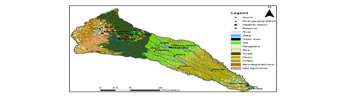 The upper Tana Land use map (2009) obtained from International Soil Reference and Information Center- Green Water Credit (ISRIC-GWC) was used as the base map to classify the land use types in the catchment. Small holder rainfed agriculture is the major land use and due to increase in population, previously uncultivated lands have been converted to agricultural lands A strip of forest cover is found in the upper parts of the catchment that separates the agricultural lands and helps in maintaining water quality and quantity [1] (Figure. 2). The major crops grown in the catchment include coffee, tea, corn and horticultural crops.