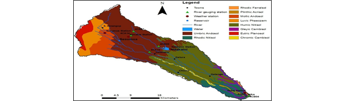 The catchment has more than 10 soil types that support different land uses as shown in Figure. 3. Dominant soil types include Umbric Andosols, Humic and Rhodic Nitisols that are found in the middle and lower reaches of the catchment where agriculture is the main land use.