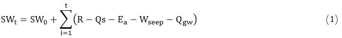 SWAT is a process based distributed hydrological model that operates on a daily time step to simulate ecosystem services. Hydrology in the catchment is divided into land and routing phase [19]. The routing phase models water and sediments movement through a river or channel. The land phase models the amount of water, sediments, pesticides and nutrients that enter the main channel in every sub-catchment. This phase is described in equation (1) where SWt is the final soil water content (mm), SWo is the initial water content in day i (mm), R is the amount of precipitation in day i (mm), Qs is the amount of surface runoff in day i (mm), Ea is the amount of evaporation in day i (mm), Wseep is the amount of water entering the vandose zone in day i (mm) and Qqw is the amount of return flow in day i (mm) [20].