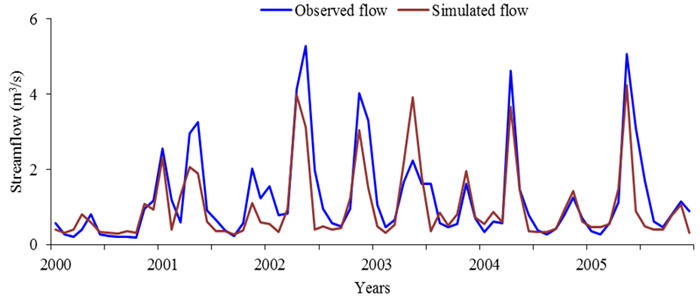 Streamflow data for the first two years (1998-2000) were used as model warm-up period for RGS 4CB05. The remaining data were split into two where those between 2000 to 2005 were used for calibration and the other (2006-2013) used for validation. To check whether the model correctly simulated the observed data spatially, graphical method was used to compare the observed and simulated values. for gauging station 4CB04 between the years 1998-2008. Begou, et al. [24] applied a similar methodology during streamflow calibration for Bani catchment in Mali. In absence of adequate continuous data for automatic calibration and validation of sediments using SUFI-2 program, bathymetric survey data collected in the catchment were used to manually calibrate and validate the model. This was achieved by adjusting the most sensitive MUSLE parameters to match the observed values in the catchment.