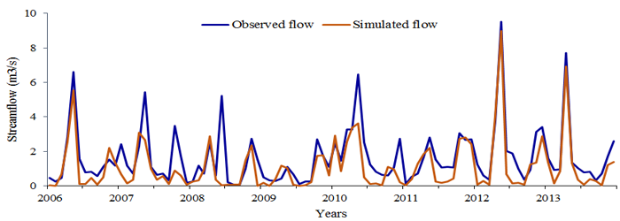Statistical performance indicators e.g. NS, Percent Bias (PBIAS), ratio of RMSE to the standard deviation of measured data (RSR) and R2 were used to check to the capability of the model to simulate the observed data. The most sensitive parameters and their respective uncertainty ranges were observed and recorded. After calibration and validation, the fitted values were used to run the model thus creating the base scenario for simulation of conservation methods, streamflow change in varying land uses and impacts of climate change on hydrological processes among others.