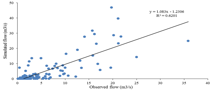 An R2 of 0.62 was obtained which implies that the model was able to simulate streamflow correctly both spatially and temporally. Begou, et al. [24] recommended the use of observed data in RGS not considered in calibration processes in order to make simulations more representative and realistic and also ensure reliable performance of the hydrological processes within the catchment. According to the authors, the use of a different location for validation takes into account the heterogeneity of land use, climate, soils and terrain. The value of R2 greater than 0.5 implies that the results of streamflow simulations are within acceptable ranges at different locations in the catchment [29].