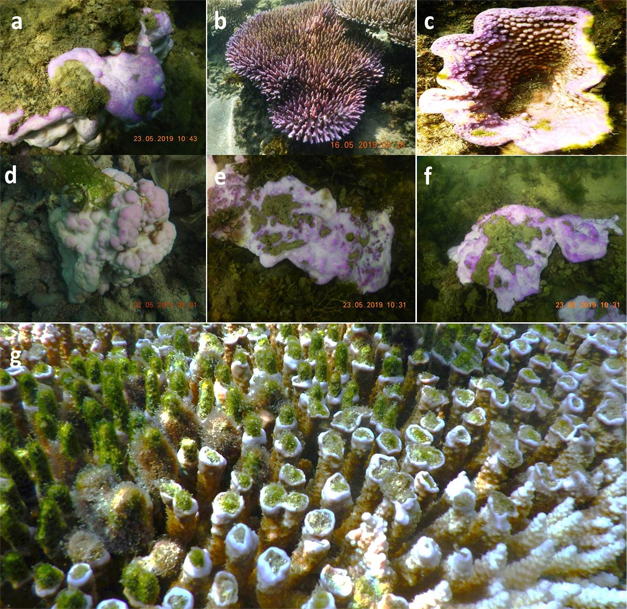 Figure-1. Purple blue pigmentation displayed by different corals in Gulf of Mannar. Purple blue pigmentation in Porites sp. (a), Acropora millepora (b), Turbinaria sp. (c), encrusting Porites sp. (d-f), and digitate Acropora sp. (g).