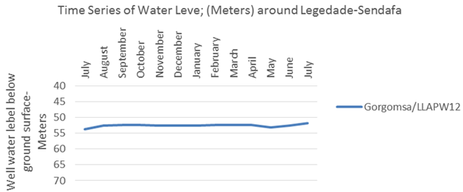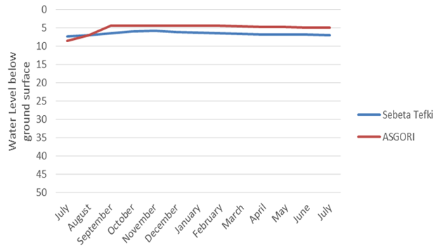 In addition to static water levels, time series of water level data was measured in both catchments for about 13 months from July 2018 to July 2019. Considerable seasonal changes were observed in wells located in Akaki well field. Actually, the groundwater table continually decline due to high and persistent abstraction Figure 5. There is very slow decline in Legedade and Sendafa areas Figure 8 wellfields; and near steady state condition in Becho Figure 6 and Adda plains Figure 7.