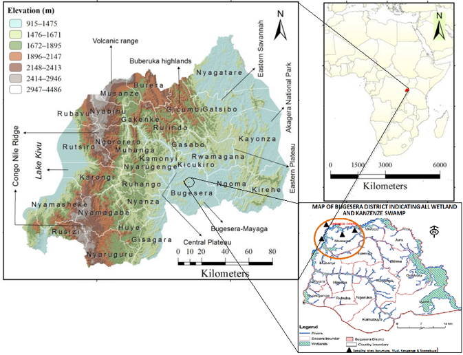 This subject was undertaken on behalf of conducting a feasibility study in Kanzenze Swamp of Akagera Upper Catchment. Kanzenze Swamp is located in Bugesera District, Ntarama sector where it is drained to Akanyaru River at Rurambi marshland geographically located at coordinates of -2.0613 and 30.0877 respectively. According to District Agricultural Report, 2003 Kanzenze marshland comprised with four main areas including Muzi, Karugenge, Nyamabuye and Karumuna sites. The total area of the swamp is about 501 ha in which 300 ha are arable areas. The major crops grown in the swamp are tomatoes, carrots, onions, eggplants and chilly. Map of Kanzenze swamp is shown in Figure 1 with four sites using Arc GIS 10.5 respectively.