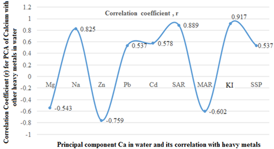 Figure 2 reveals the fact that the positive value of correlation coefficient shows the direct proportional relationship between the principal components Ca with other heavy metals in irrigation water. The direct proportional relationship with Ca was found for the factors like Na, Pb, Cd, SAR, KI and SSP. It means these factors will increase as Ca increases in the irrigation water. The minus sign of the correlation coefficient shows the inverse relationship between the principal components Ca with other factors. The inverse relationship with Ca was found for the heavy metals like Mg, Zn and MAR. The values of r vary from -1 to 1. If the magnitude of the correlation coefficient r is > |±0.5|, it means there is high correlation between Ca and other variables considered. For example, KI has the highest coefficient of correlation of 0.917, it means for every 1 ppm addition of Ca with there is 91.7% increase in Kelly Index. The lowest coefficient of correlation of -0.759 is observed for Zn. It means for every addition of Ca there is 75.9% decrease of Zn content in irrigation water.