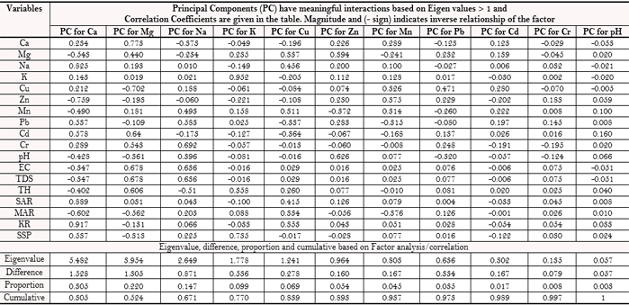Table 2 shows the total proportional variation value for the PC for Na with 0.147 (14.7%), it shows that 14.7% of the variations are due to the first factor Na, which is having highest effect after Ca and Mg. The Eigen value of Na from table 3.2 was found to be 2.649. It is higher than 1 and hence, it has strong effect on other factors in the cluster. The correlation coefficient ‘r’ of Principal Component Na with more than 0.5 was considered to be highly statistically significant based its magnitude and not based on the ± sign and shown in Figure 4.