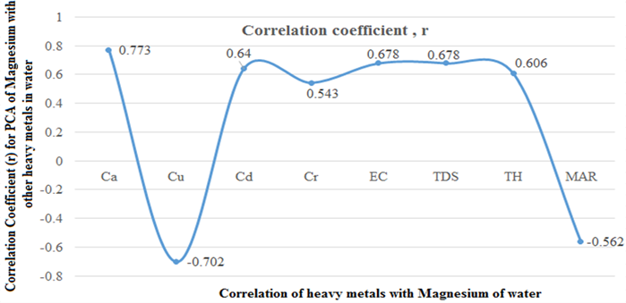 Figure 3 reveals the fact that the positive value of correlation coefficient shows the direct proportional relationship between the principal components Mg with other heavy metals in irrigation water. The direct proportional relationship with Mg was found for the factors like Ca, Cd, Cr, EC, TDS and TH. It means these factors will increase as Mg increases in the irrigation water. The minus sign of the correlation coefficient shows the inverse relationship between the principal components Mg with other factors. The inverse relationship with Mg was found for the heavy metals like Cu and MAR. The values of r vary from -1 to 1. If the magnitude of the correlation coefficient r is > |±0.5|, it means there is high correlation between Mg and other variables considered. For example, Ca has the highest coefficient of correlation of 0.773, it means for every 1 ppm addition of Mg with there is 77.3% increase in Ca in the water. The lowest coefficient of correlation of -0.702 is observed for Cu. It means that for every addition of 1mg/L of Mg there is 70.2% decrease of Cu content in irrigation water.
