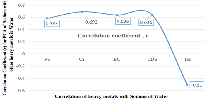 Figure 4 reveals the fact that the positive value of correlation coefficient shows the direct proportional relationship between the principal components Na with other heavy metals in irrigation water. The direct proportional relationship with Na was found for the factors like Pb, Cr, EC and TDS. It means these factors will increase as Na increases in the irrigation water.