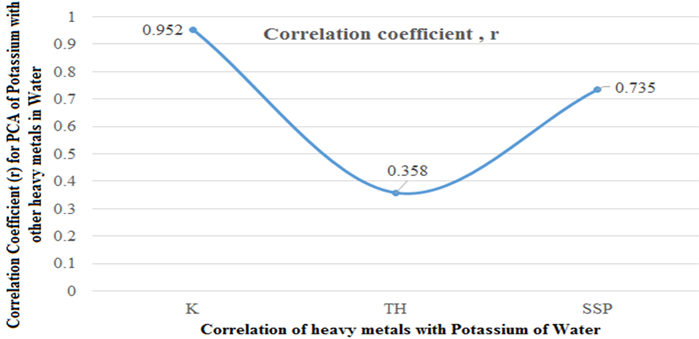 Figure 5 reveals the fact that the positive value of correlation coefficient shows the direct proportional relationship between the principal components K with other heavy metals in irrigation water. The direct proportional relationship with K was found for the factors like K itself and other factors like TH and SSP. It means these factors will increase as K increases in the irrigation water. If the magnitude of the correlation coefficient r is > 0.5, it means there is high correlation between K and other variables considered. For instance, K has the highest coefficient of correlation of 0.952, it means for every 1 ppm addition of K in ions form in water for irrigation, there is 95.2% increase in K soluble content in the water. The second highest factor is SSP with correlation coefficient of 0.735. It means that the additional of 1ppm of K in the water, the soluble Sodium percent will be increased by 73.5% in the irrigation water. The highly correlation coefficient of K and SSP is to indicate that the K ions is the major constituent of Soluble Sodium Percent and once reduced or increased in water, it will deteriorate the quality of drinking and irrigation water use.