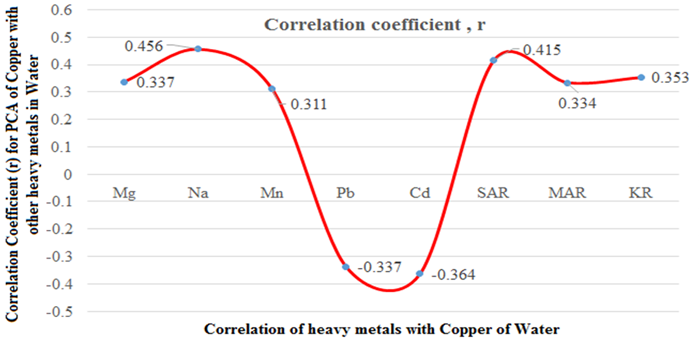 Figure 6 reveals the fact that the positive value of correlation coefficient shows the direct proportional relationship between the principal components Cu with other heavy metals in irrigation water. The direct proportional relationship with Cu was found for the factors like Mg, Na, Mn, SAR, MAR and KR. It means these factors will increase as Cu increases in the irrigation water. The minus sign of the correlation coefficient shows the inverse relationship between the principal components Cu with other factors. The inverse relationship with Cu was found for factors like Pb and Cd respectively. The values of r vary from -1 to 1. If the magnitude of the correlation coefficient r is > |±0.5|, it means there is high correlation between Cu and other variables considered. For instance, Na has the highest coefficient of correlation of 0.456, it means for every 1 ppm addition of Cu, there is 45.6% increase in Na in the water. The lowest coefficient of correlation of -0.364 is observed for Cadmium (Cd). It means that for every addition of 1mg/L of Cu there is 36.4% decrease of Cd content of irrigation water.