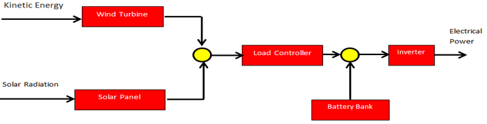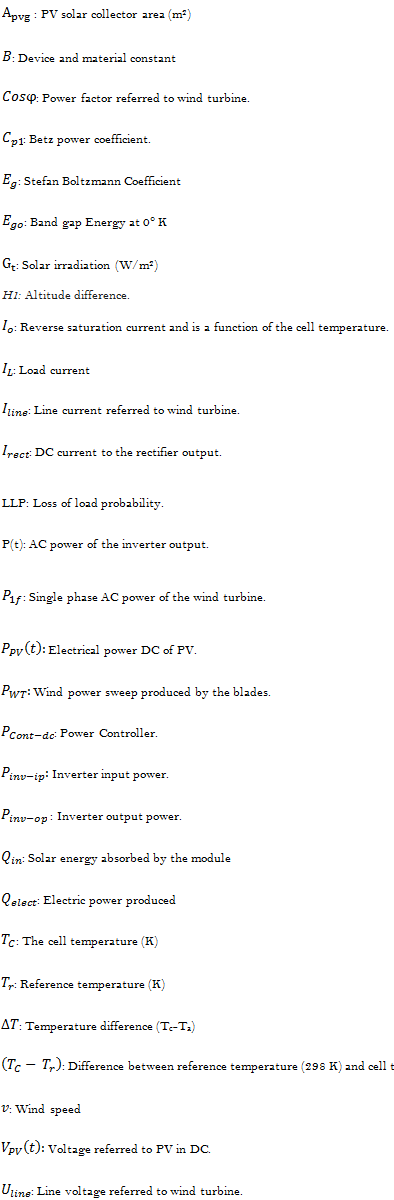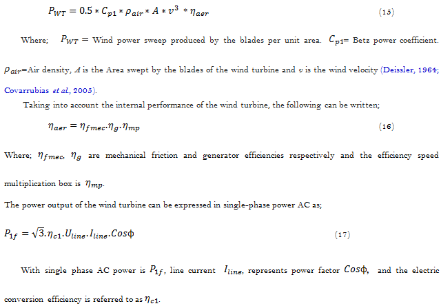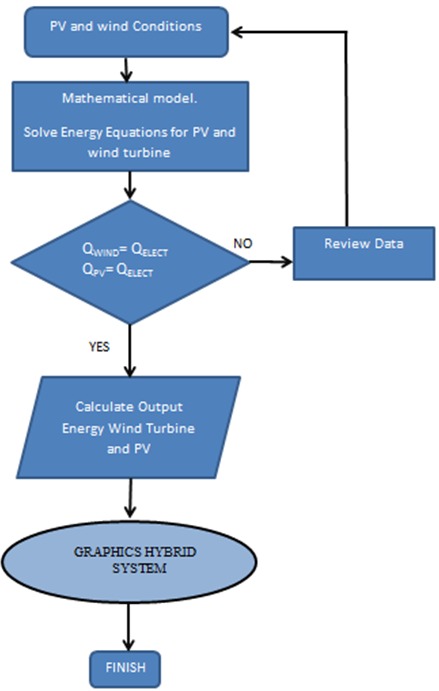 The mathematical model is based upon the energy conversion equations and this simplified model that is a representative of the parameters of the mechanical and electrical systems under investigation that directly influence the power. The model uses the LaPlace formulation to carry out the simulations of the energy transformation equations of the electric energy and solar radiation (Spiegel, 1991 ; Whiteman, 2000 ; Katsuhiko, 2003 ; Garcia, 2006 ; Wenham, 2007; Marreno, 2011 ; Penyarat and Pascal, 2012 ; Akikur et al., 2013 ; Dustin and Jack, 2014 ). This process allows us to find the best design option of the hybrid system. Figure. 2 presents the scheme used to study and simulation the energy formulation of the PV and wind turbine and can be used in the future for other types of renewable energy. However it should be pointed out that adjustments and calibrations must be made for integration of new types of renewable energy. In our case study, this model is intended for remote areas that are not connected to the grid.