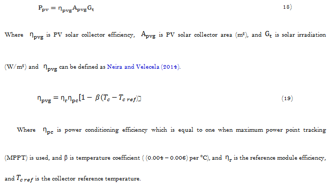 The thermal energy absorbed by the PV solar collector is (Neira and Velecela, 2014 ; Peterseim et al., 2014 ; Sami and Icaza, 2015 ; Sami and Icaza, 2015 ; Sami and Marin, 2017 ).
