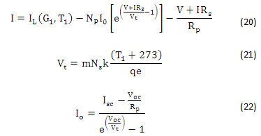 The characteristics performance” I-V” of the PV solar panel can be described by the following (Peterseim et al., 2014 ; Srinivas and Reddy, 2014 ; Sami and Marin, 2017 ).