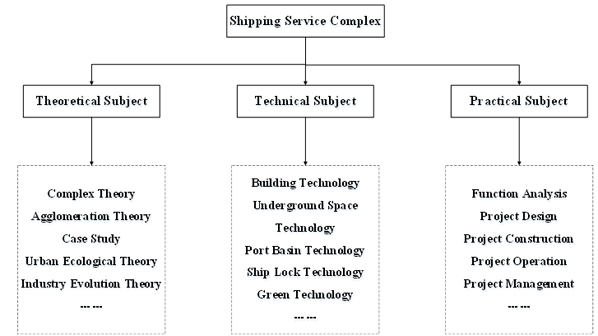 After analyzing the external system, it is necessary to further develop the shipping service complex itself, exploring its composition and factors. From the perspective of the system theory, the shipping service complex system was decomposed into three aspects: theory, technology and practice, reflect its spatial organization, development level and evolution process. (See Fig-2)