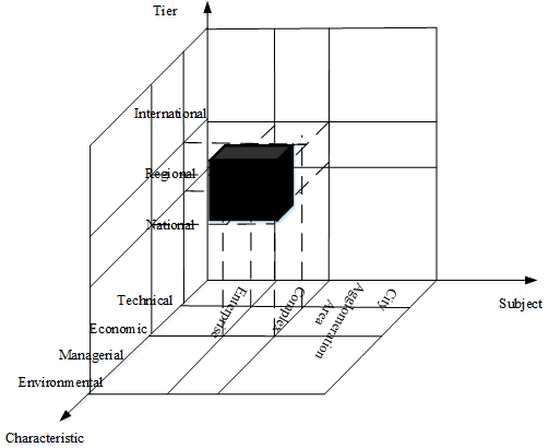 The whole process was divided into three stage, including the system structure analysis, factor discussion and the formation of the standard system. The system structure was analyzed from theoretical, technical and practical subjects externally and internally, where the outline was completely depicted. Then, the factor was discussed and further classified under the three-dimensional attribute space. The aforementioned classification methods complied with each other, and have a good normative effect on the establishment of the entire standard system, which not only reflects the level of the standard, but also includes the subject characteristics. As shown in Fig-3, the main content of the standard is determined by the two-dimensional space composed of subjects and characteristics. Starting from the origin of the coordinate axis, the theoretical, technical and practical sections are built on the subject dimension. And four attributes as technology, economy, management and environment depended on the characteristic dimension. Finally, the level of the standard is determined by introducing a vertical tier dimension on the plane formed by the two dimensions. Such a three-dimensional space not only embodies the content in detail, but also contains their measurement, thus obtaining a relatively scientific and integral standard system.