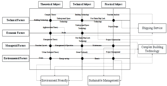 The subject and characteristic dimension basically cover all the elements of the standard system. However, the factors are reproducible to a certain extent due to the cross complementarity of them. Therefore, it is necessary to construct a scientific and reasonable standard system by integrating similar elements. As shown in Fig-4, a two-dimensional plane is built, and the intersections (black dots in Fig-4) are marked. For example, the “complex theory” in theoretical subject can be combined with the “building technology” in technical subject, which both belong to the “Complex Building Technology”. Similarly, the “economic theory” and the “profit” can be summarized as part of the “Shipping Service”. What’s more, the “urban ecological theory” shares the same function with “green” and “energy-saving” in environmental factors as “Environmental Friendliness”. After summarizing and integrating, the initial structure of the standard system is formed with four aspects as shipping service, building technology, environment friendly and sustainable management.