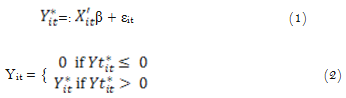 Tobit models are a form of linear regression, also called a censored regression model. If a continuous dependent variable needs to be regressed, but is skewed in one direction, the Tobit model is used. The Tobit model allows regression of such a variable while censoring it so that the regression of a continuous dependent variable can happen. It allows the analyst to specify a lower (or upper) threshold to censor the regression at while maintaining the linear assumptions needed for linear regression. In the standard Tobit model (Tobin, 1958) we have a dependent variable y that is left-censored at zero as showed in Equation 1 and Equation 2: