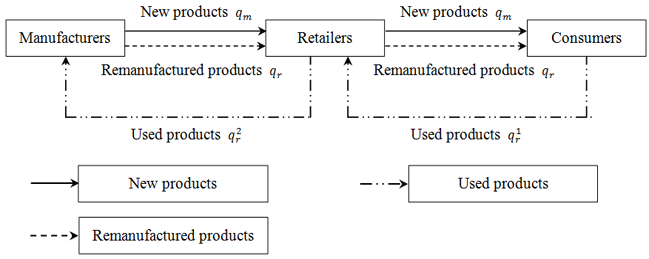 Like much of literature on remanufacturing, it is assumed that closed-loop supply chains are composed of a manufacturer and a retailer. WTP of new and remanufactured products differs, that is, consumers distinguish new and remanufactured products, and consumer preference for new and remanufactured products varies. In the model, the manufacturer serves as the leader in the channel, having the prominent channel advantage; the retailer serves as the follower. The manufacturer makes both new products and remanufactured products by using used products collected by the retailer, who sells new and remanufactured products made by the manufacturer. The Stackelberg game theory is deployed to consider the pricing models in centralized and decentralized decisions. Based on WTP, this study explores the impact of the uncertain recovery rate and remanufacturing rate discrepancy on the pricing strategy in closed-loop supply chains. Figure 1 shows the members in closed-loop supply chains, a single manufacturer and a single retailer, who form a closed loop.