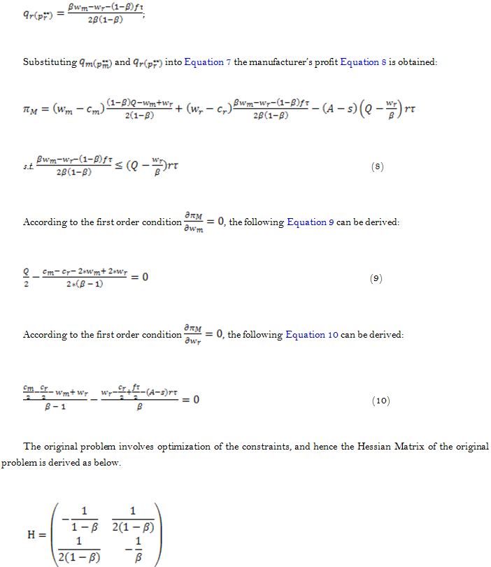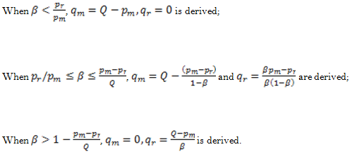 This part concerns the manufacturer’s decision problems in decentralized decisions. In this decision, when WTP of new and remanufactured products varies, the manufacturer’s profits come primarily from sales of new and remanufactured products with uncertain remanufacturing rate. Also, inventory and stock-out are not considered, and only the remanufacturing cost is taken into account. Below are the specific optimization problems: