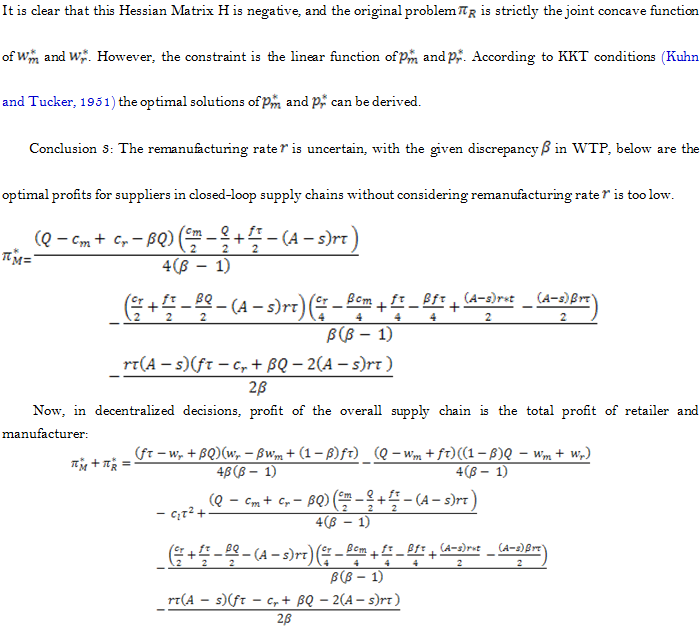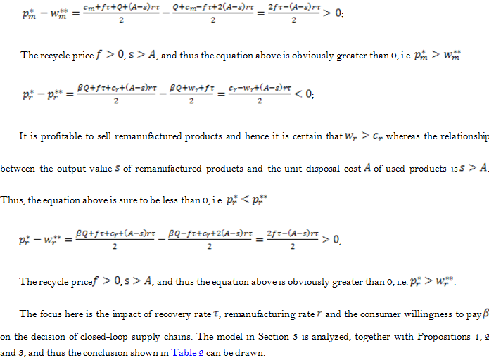 Willingness to Pay (WTP) is what consumers are willing to pay for certain goods and services, which is also the evaluation of a product and service. WTP in this article varies when consumers choose new and remanufactured products; in other words, consumers can differentiate new and remanufactured products. Shi et al. (2015) look at the competition in remanufacturing when the supply chain consist of manufacturers who use new products and remanufacturers who recycle core components, they find that WTP has a significant impact on the manufacturer's performance and the stability of Nash equilibrium. Since the remanufacturing technology develops relatively slowly and consumer awareness of remanufactured products is inadequate, the willingness to pay for remanufactured products is relatively low. However, recovery rate and remanufacturing rate can be a very beneficial perspective in the study of closed-loop supply chains of remanufacturing. In these perspectives, here the consumer willingness to pay varies; that is, consumers show different levels of acceptance of new and remanufactured products. Not all used products can be recycled and not all recycled products can be remanufactured, and as a result, the impact of recovery rate and remanufacturing rate on the pricing strategy of closed-loop supply chains are investigated.
