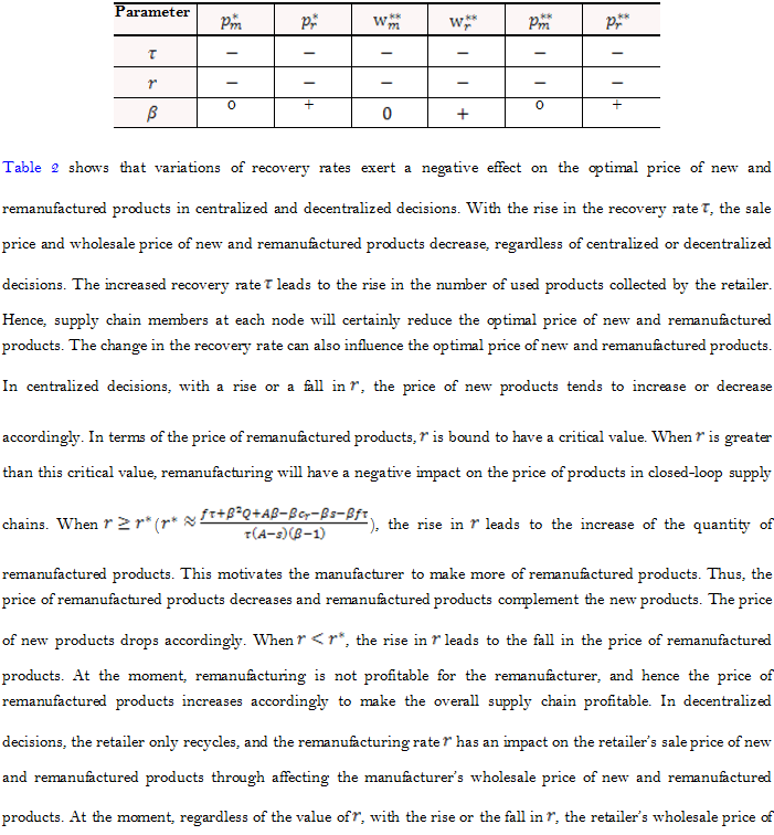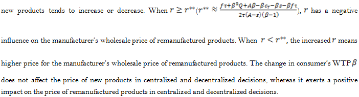 The analyses above show that the price of new and remanufactured products in closed-loop supply chain varies in centralized and decentralized decisions and the profit of the entire supply chains also differ.