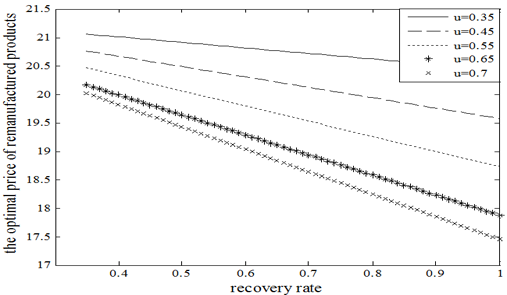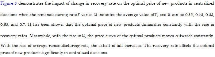 Figure 2 shows that as the remanufacturing rate increases continuously, the optimal price of new and remanufactured products falls in centralized decisions. It also shows that with uncertain recovery rate, increase in remanufacturing rate leads to lower optimal price of new and remanufactured products. With the constantly rising remanufacturing rate, the extent of fall in the optimal price diminishes, indicating that the impact of remanufactuirng rate on the optimal price of new and remanufactured products reduces when the remanufactuirng rate increases to a certain extent. The figure illustrates that the price of new products is apprarently higher than that of remanufactured prices, because of the WTP discrepancy between new and remanufactured products. Consumers tend to prefer new products.