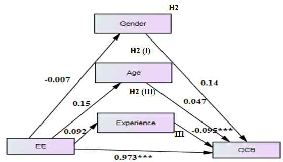 As the previous studies about demographic attributes and OCB was conducted based on altruistic attitude and was based on developed infrastructural economy, and most of the studies focused on establishing demographic influence on developing employee engagement and OCB, the focus of this study was to identify the mediating role of demographic attributes (age, gender, experience) between EE and OCB in a relatively competitive working environment in a developing economy such as Bangladesh. Therefore, there is scarcity of evidence on how demographic attributes (age, gender, experience) mediates the relationship between employee engagement and organizational citizenship behavior. Furthermore, this study also attempted to investigate the impact of more demographic attributes (gender and work experience) on the relationship between EE and OCB as well. . Literature regarding any linkage of these demographic attributes on the relationship between EE and OCB shows very few indications which lead to the following hypothesizes: