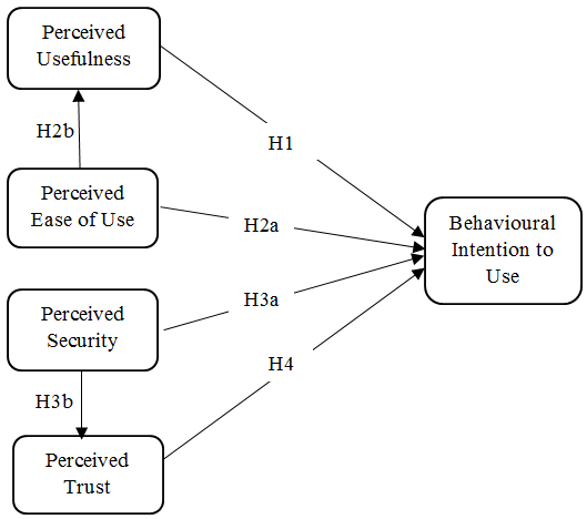 In many technology-related contexts, the validity of TAM had identified as a stingy model in various studies (Davis 1989; Davis., Bagozzi, & Warshaw, 1989) cited in Barry and Jan (2018). TAM’s stinginess in many literature reviews defined as a key limitation (Venkatesh & Davis, 2000; Vijayasarathy, 2004). It is in fact the theory of information services that model how users adopt and use a technology (Dauda & Lee, 2015). Several researchers have extended the TAM model and applied it to many different technology-related studies consist of e-learning (Al-Maroof & Al-Emran, 2018; Cheung & Vogel, 2013) m-commerce (Barry & Jan, 2018) and short message service (Muk & Chung, 2015) because the variable of TAM may not capture the key factors to determine consumers’ intention to use information system (Ha & Stoel, 2009). To study the usage intention of new technology, TAM is considered as well-recognized extensions in academic research (Aydin & Burnaz, 2016). It is further advised to include a few additional variables to strengthen the TAM model (Jaradat, 2013). One of the extended variable “security” found to have antecedents of intention to use a particular information system (Barry & Jan, 2018). Based on the above statements, this study includes security (Barry & Jan, 2018) and trust (Singh & Srivastava, 2018) as extended variables to examine the behavioral intention to use smartphone mobile banking apps. The other two variables are perceived usefulness and perceived ease of use.