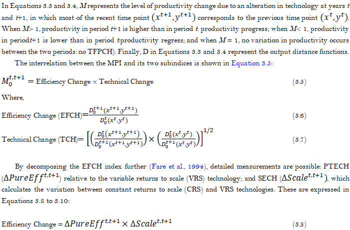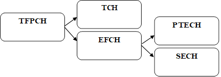 Efficiency and productivity are interrelated in the current study: changes in the former are affected by alterations in the latter. The input–output ratio can be used to determine productivity, but it is important to remember that efficiency fails to take account of the time taken by the production process. Therefore, MPI,sometimes referred to as TFP, has been widely adopted for DEA in a range of countries and sectors due to its ability to assess any change in efficiency or technology in terms of progress or regress over time. Output-based MPIis used to not only measure and understand the change in productivity of banks but also to determine the change in TFP (TFPCH), which can be decomposedinto technical change (TCH) and efficiency change (EFCH). In addition,EFCH can be further decomposed into changes in scale efficiency (SECH) and pure technicalefficiency (PTECH). Figure 1 illustrates these interactive relationships.
