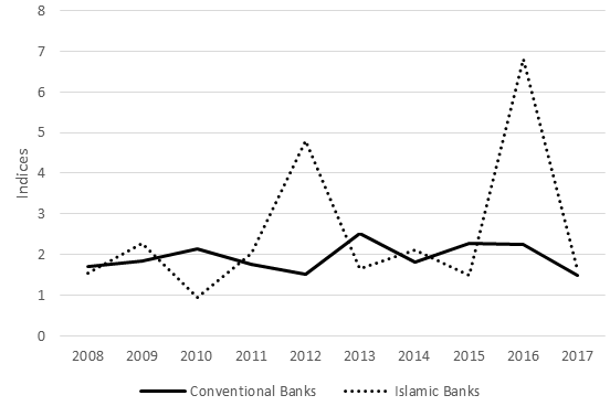 There have been previous comparative studies with varying findings:some show that Islamic banks are significantly more productive thanconventional banks, othersshow the opposite,while a few show no difference.More recently, Alexakis, Izzeldin, Johnes, and Pappas (2018) reported that both Islamic and conventional banks experienced a decline in productivity, thoughto a greater extent in the latter, during 2008/09. Maredza and Ikhide (2013)stated that this was probably due to GFC in the Gulf Cooperation Council (GCC) banking sector. The results also indicated that there were differences in technological changes and efficiency between GCC Islamic banks, possibly because a number of mature banks do exist in a developing banking sector, although itmay be owing to the various financial products, bank status, client base, and innovation.