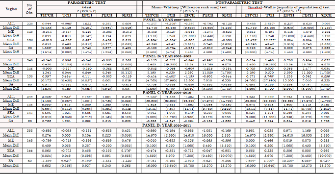 In the ME, there wasgreater productivity progress in Islamic than conventional banks in seven years of the study period, andthe results are significant at the 1% level in 2016 (Panel I);however, when the reverse occurred in 2010, 2014, and 2015 (Panels C, G, and H), the greater progression in conventional banks is statistically significant in each year. In addition, Islamic banks experienced relatively more productivity progress thanconventional banks: in 2008 (at 1% significance level), 2012, and 2015, 2016 (at 10% significance level), and 2017 (Panels A, E, H, I, and J) in SEA; and in 2011(at 1% significance level), 2012, 2014, and 2016(Panels D, E, G, and I) in SA. Nonetheless, in SA,conventional banks exhibited more productivity progress in 2008, (at 10% significance level), 2009, 2010, 2013, 2015, and 2017 (Panels A, B, C, F, H, and J).