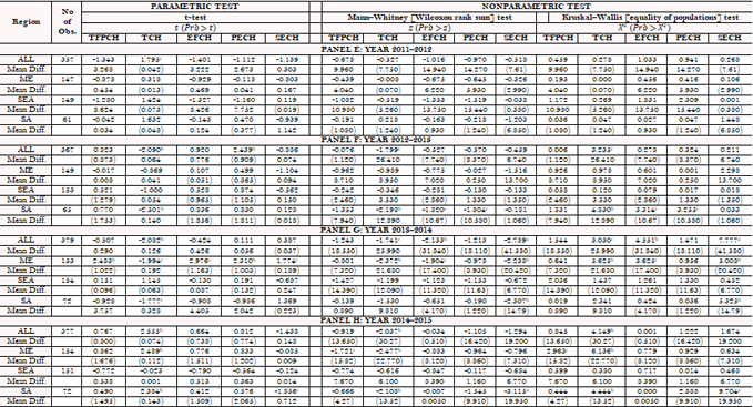 Table 6 presents the results of the parametric (t-test) and nonparametric (Mann-Whitney [Wilcoxon] and Kruskal–Wallis) testsand reveals the significant difference between the productivity levels of Islamic and conventional banks in specific years and regions. As already observed,it appears that Islamic banks are slightly more productive than conventional banks across all regions;however, the difference is only statistically significant during 2016 (Panel I). On the other hand, the t-test results, confirmed by the nonparametric tests, in Panels A, C, F, and H suggest that conventional banks were relatively more productive, though only statistically significant in 2010 (Panel C).