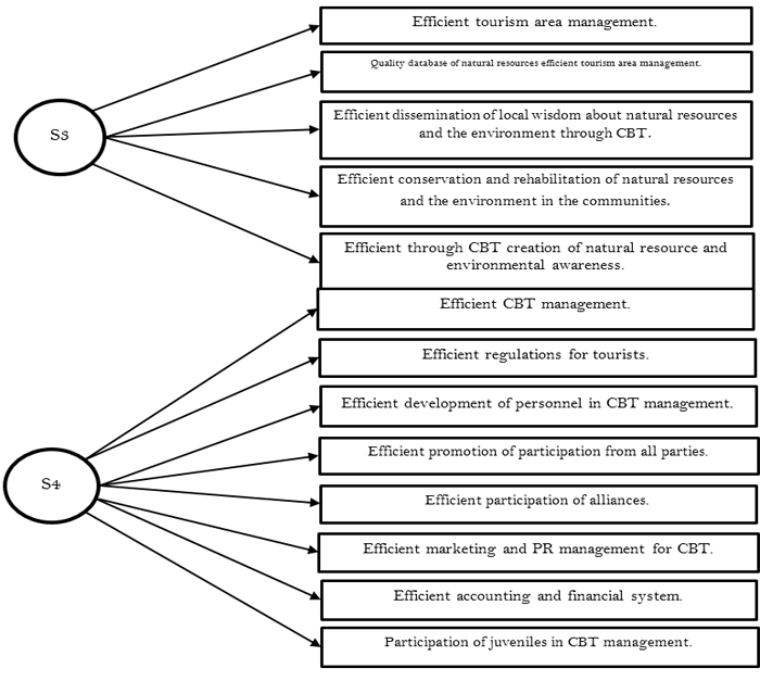As illustrated in Figure 5, for the factors of sustainable tourism development as described in the five dimensions, the sustainable tourism development in the communities (s4) has the highest effect (0.89) with a confidence level of 99%. Good quality of life, economic, and social management (s1) = 0.79 with a confidence level of 99%. Cultural heritage conservation and promotion (s2) = 0.81 with a confidence level of 99%. Systematic and sustainable resource and environmental management (s3) = 0.85 with a confidence level of 99%. Services and safety (s5) = 0.86 with a confidence level of 99%.