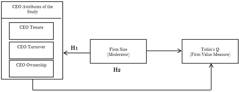 Given the review of related literature, a conceptual model of the study was designed to assess the relationship between CEO attributes and firm value, moderated by firm size. Within this context, the independent variable is CEO attributes, the dependent variable is firm value, and the moderating variable is firm size.