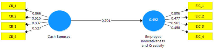 Following the satisfactory results of the measurement model, the next stage in the analysis was to employ the structural model for hypothesis testing. To achieve this, the PLS-SEM software bootstrapping structural analysis procedure was used to determine the structural effect of cash bonuses on employees’ innovativeness and creativity in the Nigerian banking sector. The results in Figure 3 and Table 3 indicate the effect of the independent variable on the dependent variable in the study.