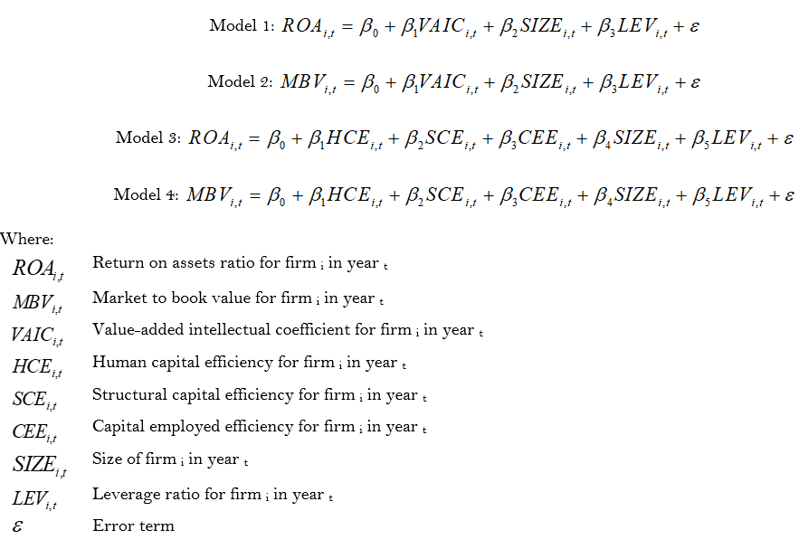 Models 1 and 2 examine the relationships between VAIC as a measure of capital efficiency and a firm’s financial and market performance, respectively, while models 3 and 4 are concerned with the relationship between the components of VAIC for both financial and market performance.