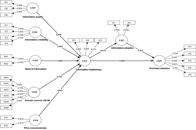 In accordance with the study of Erkan and Evans (2016), the present study, influenced by the Information Adoption Model (IAM), used information quality, information credibility, information helpfulness, and information adoption as the major characteristics of information. The need for information and attitude toward information variables were taken from the Theory of Reasoned Action (TRA). Expanding on Erkan and Evans’s (2016) study, the present study added some variables. Price, an important marketplace cue that has the power either to attract or repel customers (Lichtenstein, Ridgway, & Netemeyer, 1993; Monroe, 1979), was added to the research model.