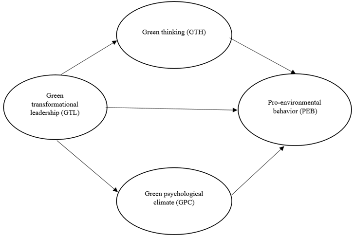 Xu, Gao, Cai, and Jiang (2022) pointed out that leaders’ green supervisory behaviors positively impact followers’ environmental outputs. Caldera, Desha, and Dawes (2019) stated that the objectives of lean and green thinking (GTH) for firms include waste and pollution reduction through strategies that focus on resource optimization. GTL offers a clear environmental vision and inspires subordinates to manifest PEB in order to achieve an organization’s environmental goals (Mukonza & Swarts, 2019). GTH is linked to human cognitive abilities and actions, and it leads individuals to show concern for the environment (Ali et al., 2020). Employees under a green transformational leader have a tendency to engage in GTH and this can lead to the development of new green processes and products. The study by Begum et al. (2022) found a significant positive relationship between GTL and GTH. Therefore, it is hypothesized that: