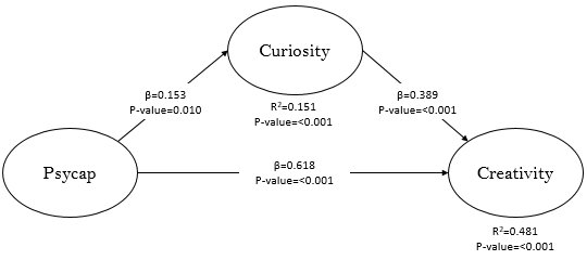 Table 3 and Figure 1 show that Psycap -> Curiosity has a coefficient value of 0.153 with a p-value of 0.010, Psycap -> Creativity has a coefficient value of 0.618 with a p-value of <0.001, and Curiosity -> Creativity has a coefficient value of 0.389 with a p-value of <0.001. The R-squared value of Curiosity is 0.151, and that of Creativity is 0.481. The calculation results mean that all the hypotheses proposed in this study are accepted.