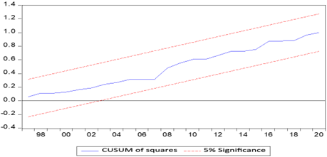 Figure 2 displays the Cumulative Sum of Recursive Residuals, which assesses coefficient changes. The CUSUM Test, conducted at a 5% significance level, reveals that the plot stays within the lower and upper critical bounds, indicating model stability. The Cumulative Sum of Recrusive Residuals evaluates the changes in the coefficients. The CUSUM Test indicates that at a given 5% significance level, the plot remains within the lower and upper critical bounds, indicating that the model is stable. The results of the CUSUM of Squares are given: