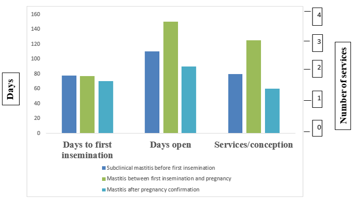Figure-1. Effects of mastitis occurred at different times on days to the first insemination, days open, and services per conception. ].