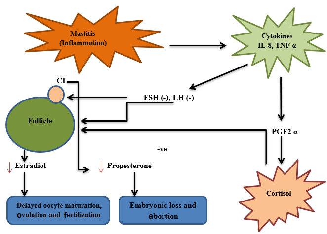 In the limelight of the relation of subclinical mastitis and fertility, the possible mechanism which affects conception rate and maintenance of pregnancy will be demonstrated here. The immediate impact of subclinical mastitis regarding reproductive performance is the disruption of the endocrine mechanism associated with androgens. Shortly, the inflammation mediators and bacterial endotoxins released through induction of mastitis such as cytokines, interleukins, and prostaglandin F2α (PGF2 α) affect the endocrine pathways related to reproduction [18]. This causes the disturbance in hypothalamo-pituitary-ovarian-uterine axis [41] which results in altered reproductive parameters of cows, causing anestrous, anovulation and infertility. Further, the cows affected with the subclinical or clinical disease showed delayed estrous cycle resumption which prolongs the period between calving and first service [36, 42].