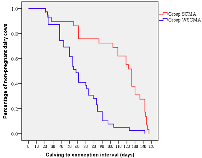 Data on CFOI, CFSI, CCI, NPC between cows positive and negative for SCMA were analyzed using Independent-Samples T-Test. The CCI at 150 days in milk was evaluated using time-to-event analyses (Austin, 2017). Furthermore, data on PPA for cows positive and negative for SCMA were compared by Pearson’s chi-Square Test. Analyses were performed using SPSS software version 22.0 for windows (SPSS, 2013). Ninety-five percent confidence interval (95% CI) for each SCMA prevalence estimate were computed by using the EpiTools software (AusVet Animal Health Services, 2015). In all analyses, the level of significance was set at p<0.05.