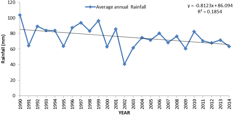 Figure-2. Year to year variability in annual average rainfall and its trend over the last 24 years (1990-2014) in Merti district. |