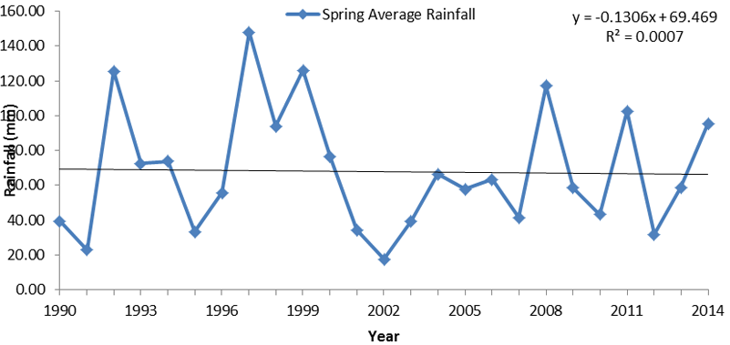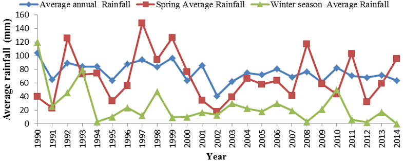 Figure-3. Year to year variability in annual Spring Rainfall Average of Merti district (1990-2014). |
