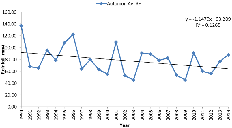 As can be seen from figure 2, the district has experienced years of a general decrease in average rainfall amount over the past 24 years. That is, 1991, 1995, 1998, 2000, 2002, 2005, 2007, 2009, 2011, 2012, 2013 and 2014 were concluded as the years with minimum average annual rainfall while the years 1990, 1997 and 1999 were said to be periods of maximum average rainfall of the districts irrespective of the years 1992, 1993, 1994, 1996, 2001 and 2010 with a constant linear plot in the graph were times of regular precipitation. As a result, during the periods 1991, 1995, 2000, 2002 and 2003, the district has experienced highly decreased amount of rainfall with a great deal of irregularity which could be mentioned as unseasonal or erratic showing high fluctuation and distribution across the district with a convergent exception in 2002 which follows extra alarming decline in rainfall which also showed serious drought challenge. Ahead of 2004 it was the years of decrease constantly in rainfall pattern in the district.