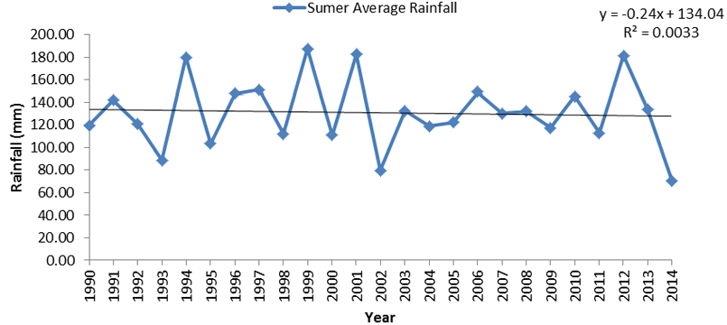 The most important rainy season of Ethiopia is Summer (Kiremt) (June- September), the season before spring and next to autumn comprising of months June, July and August, which is most agricultural activities of the country done here. This season is also known as long (main) rainy season. Summer average rain of the area is supposed to decline annually since 1990-2014. During this season the minimum amount of rainfall was (70.4 mm) recorded during 2014 and the maximum amount of rainfall was (187.43 mm) which was recorded in 1999. While the total annual rainfall during the season 3273.07 mm. As the figure below describe a higher variability in rainfall was observed in this season with a standard deviation of 0.003. The season’s average annual rainfalls generally show a decreasing trend (Figure 6).